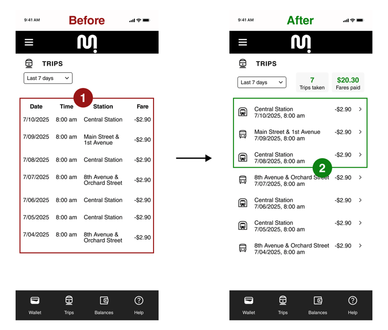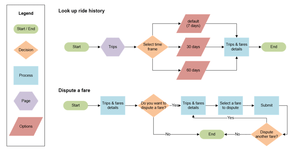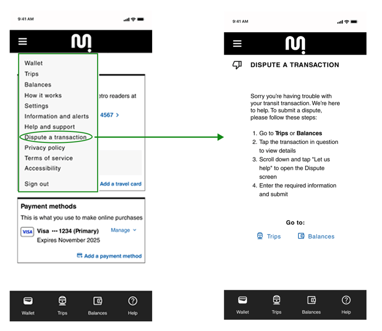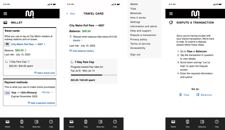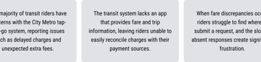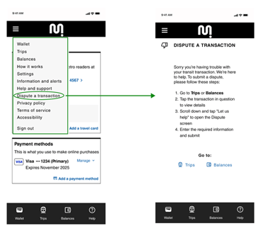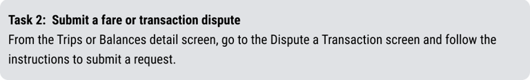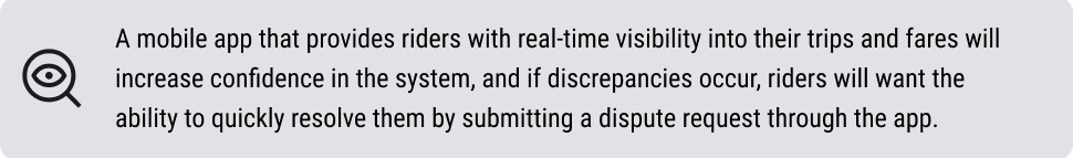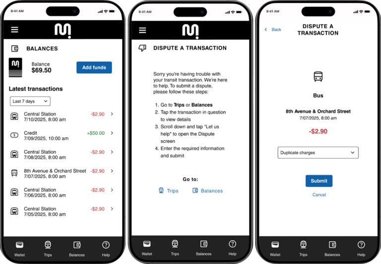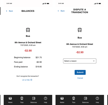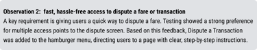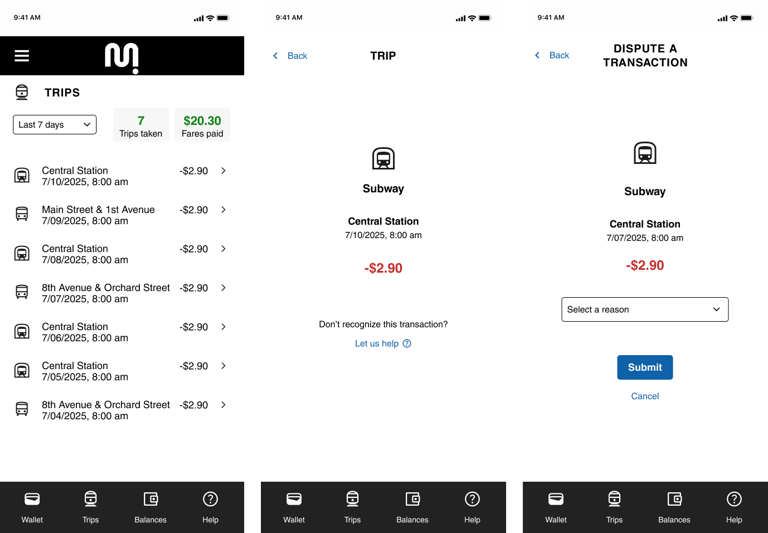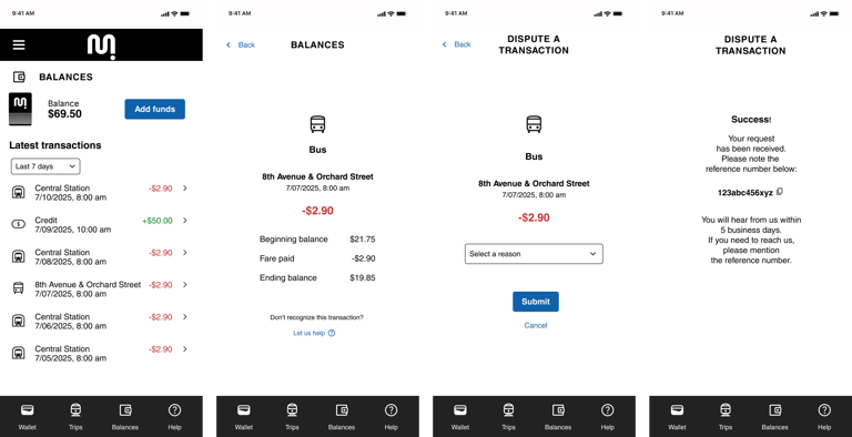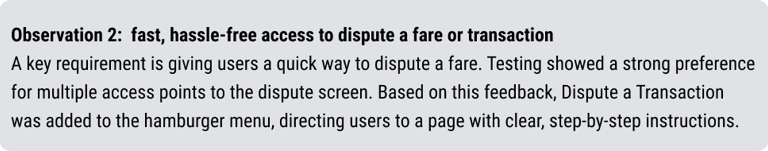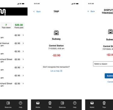 Multiple user flows were tested and refined to deliver a seamless journey that addresses potential challenges. The goal is for users to use the app to look up history and dispute a fare without experiencing major roadblocks.