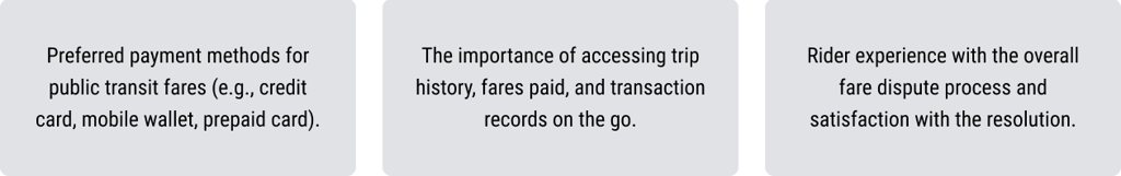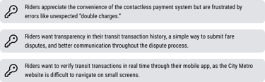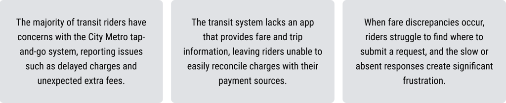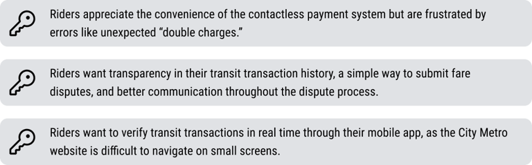 Interviews were conducted to validate the hypothesis and uncover new opportunities and ideas. Participants were regular transit riders using contactless payment methods. Sessions were held both in person and virtually, focusing on three key areas: