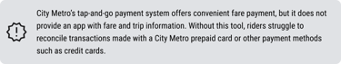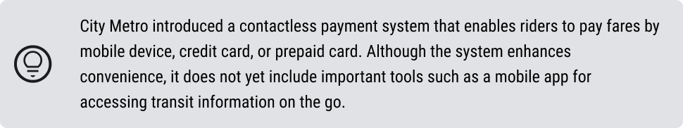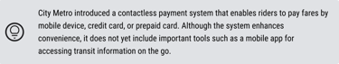 A SWOT (Strengths, Weaknesses, Opportunities, Threats) analysis was conducted on transit contactless payment methods, including prepaid transit cards and major credit cards. The evaluation aimed to identify best practices, uncover mobile app feature gaps, highlight industry trends, and generate actionable insights.